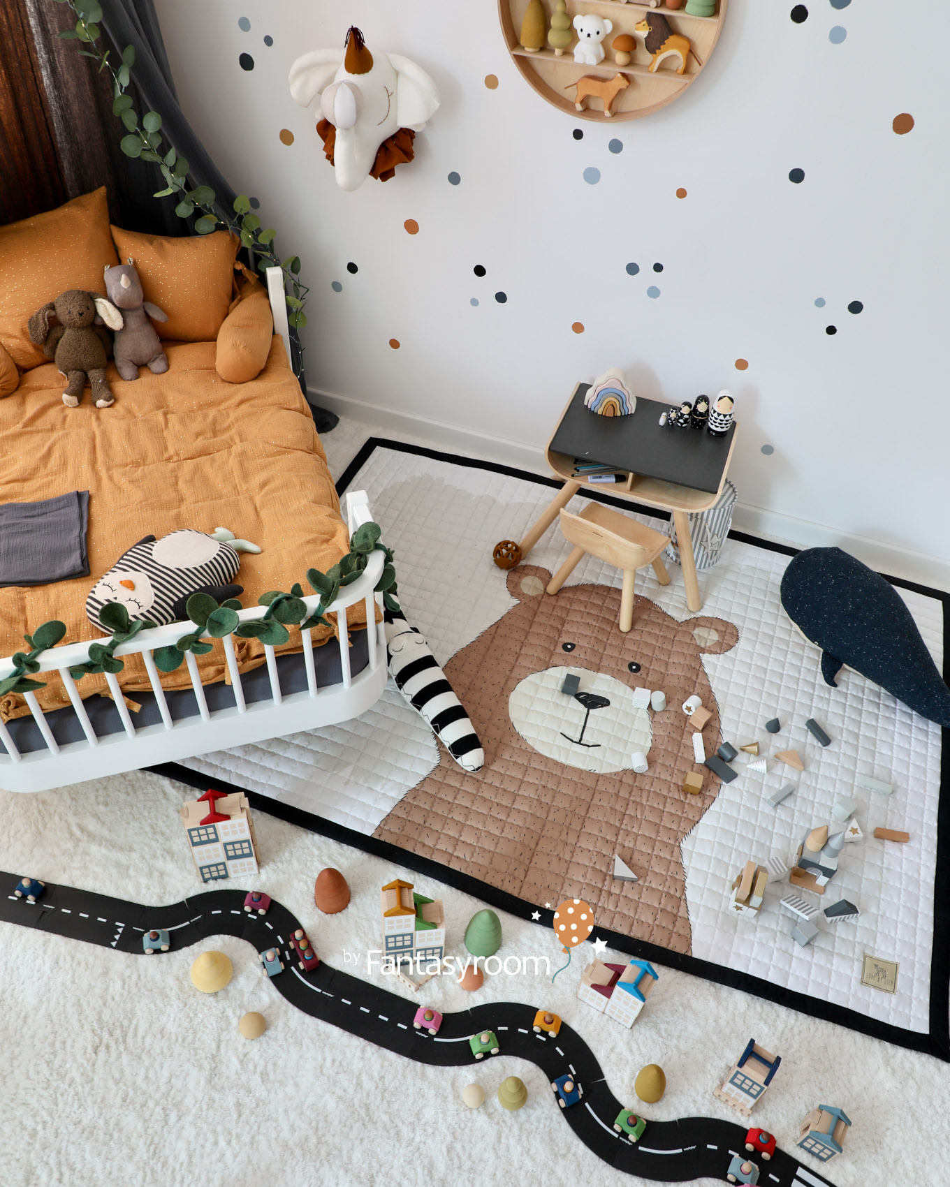 Hast du ein großes Kinderzimmer, ist es oft sogar noch schwieriger Gemütlichkeit reinzubringen. Dann kannst du verschiedene Zonen schaffen: eine Spielecke, eine Kuschelecke, eine Schlafecke und evtl. sogar eine Bastelecke.
