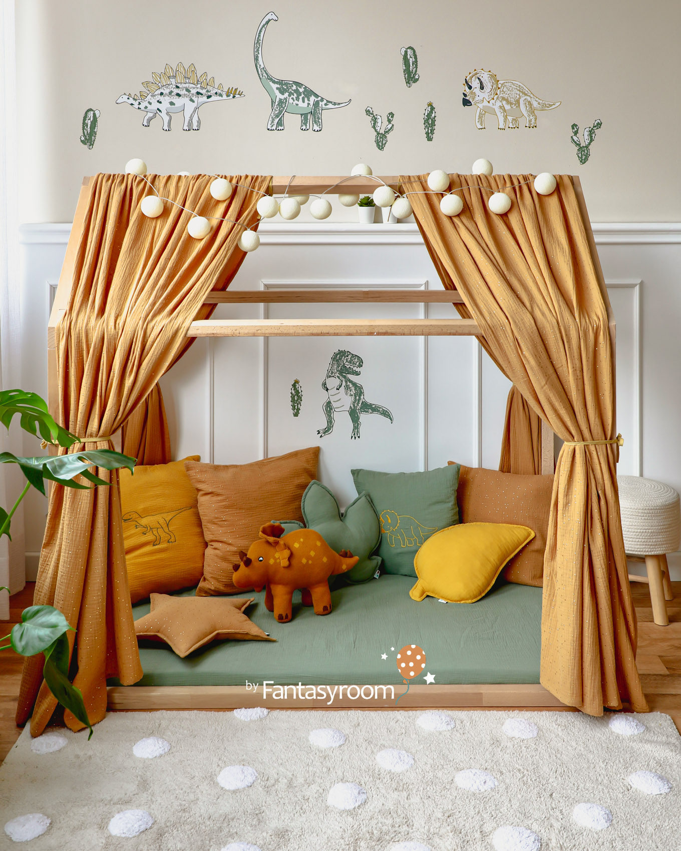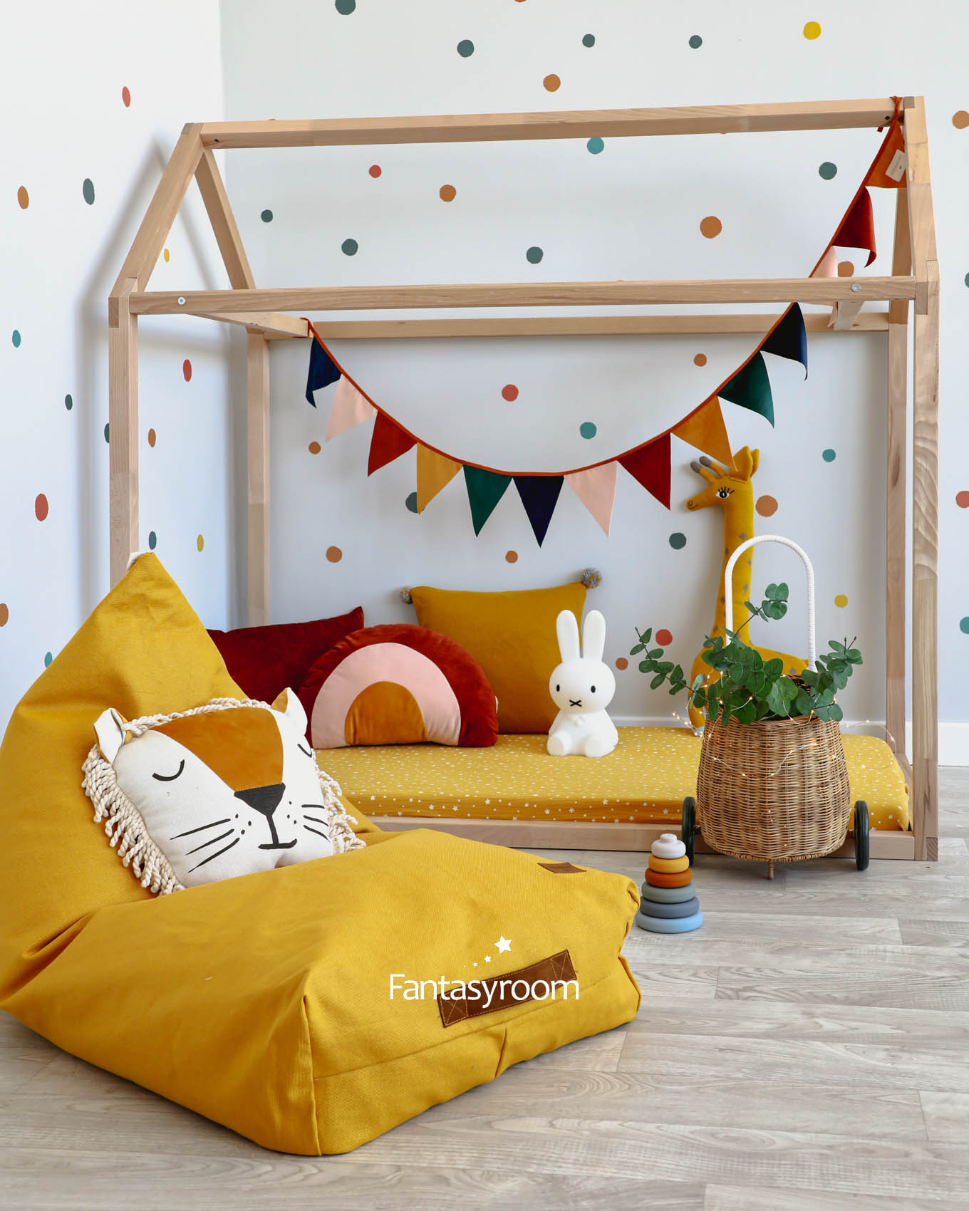 Wenn dein Kinderzimmer zu klein für 2 Betten ist, kannst du das Hausbett natürlich auch als Schlafplatz und Kuschelecke einrichten. Nachts wird darauf geschlafen, tagsüber wird der Schlafplatz zur Spielecke.