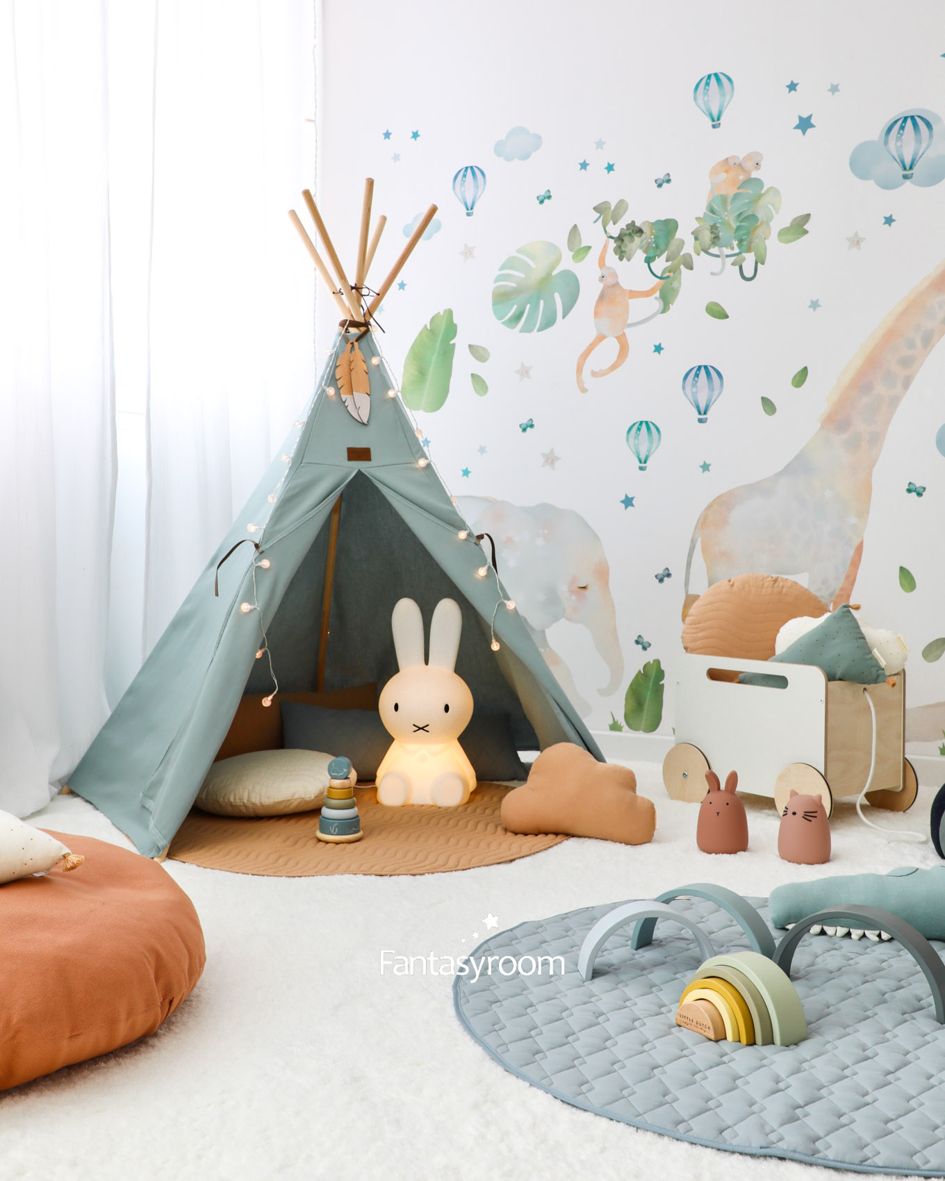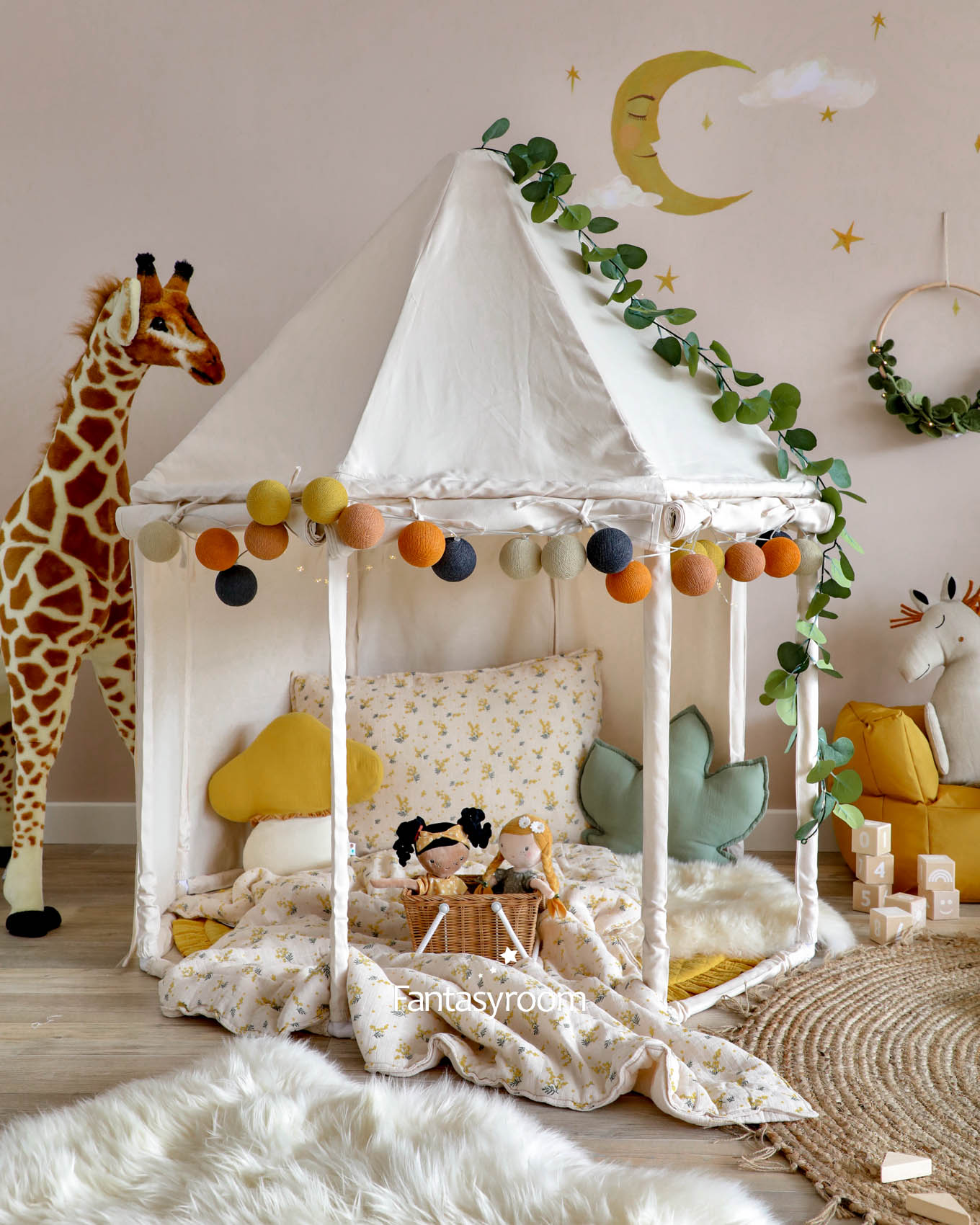 Dazu lässt sich ein Spielzelt immer wieder umdekorieren: mit Girlanden, Lichterketten, Blumenzweigen usw. Wenn du gerne umdekorierst, kannst du dich in dieser Kuschelecke richtig austoben! Schlichte Tipis in neutralen Farben sind geschlechtsneutral und lassen sich auch für mehrere Kinder oder kommende Geschwister verwenden.