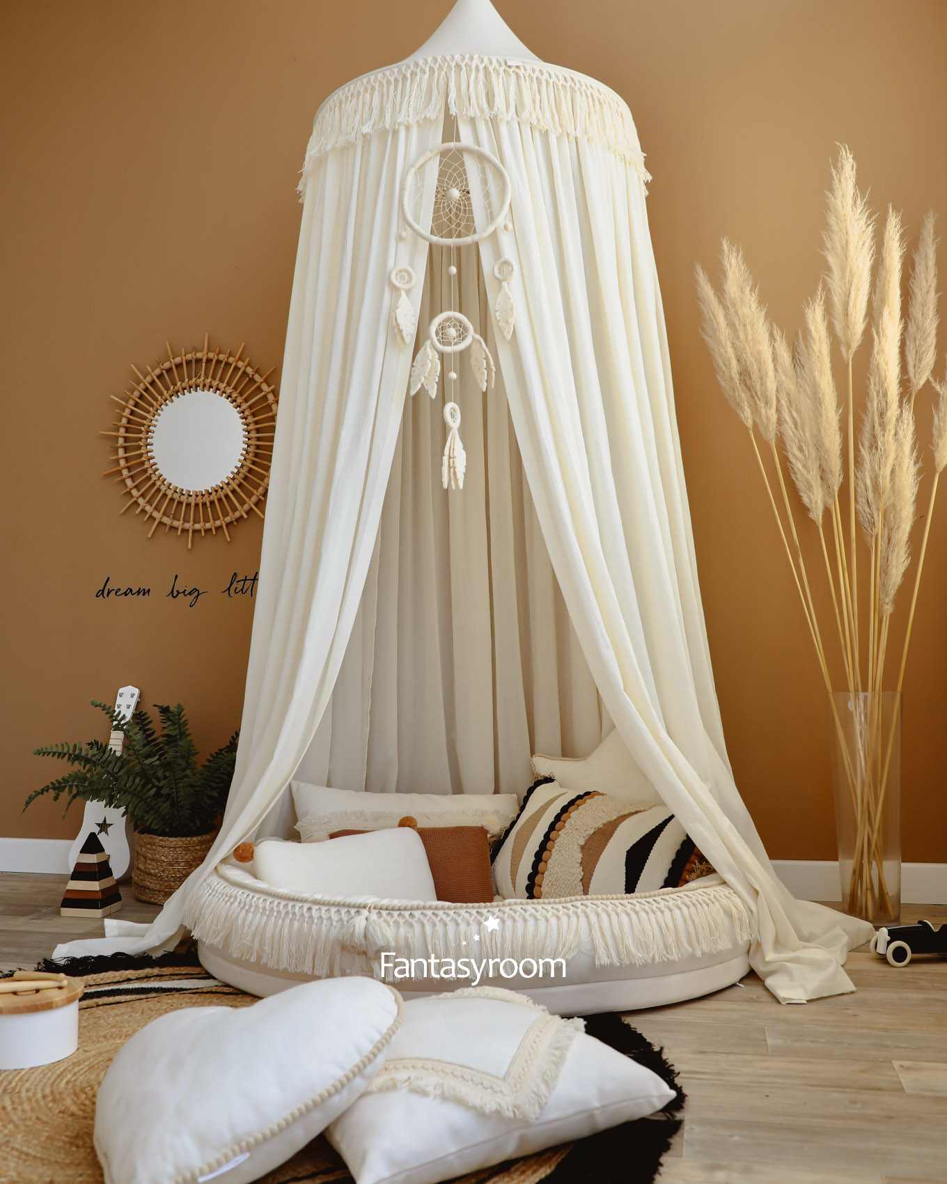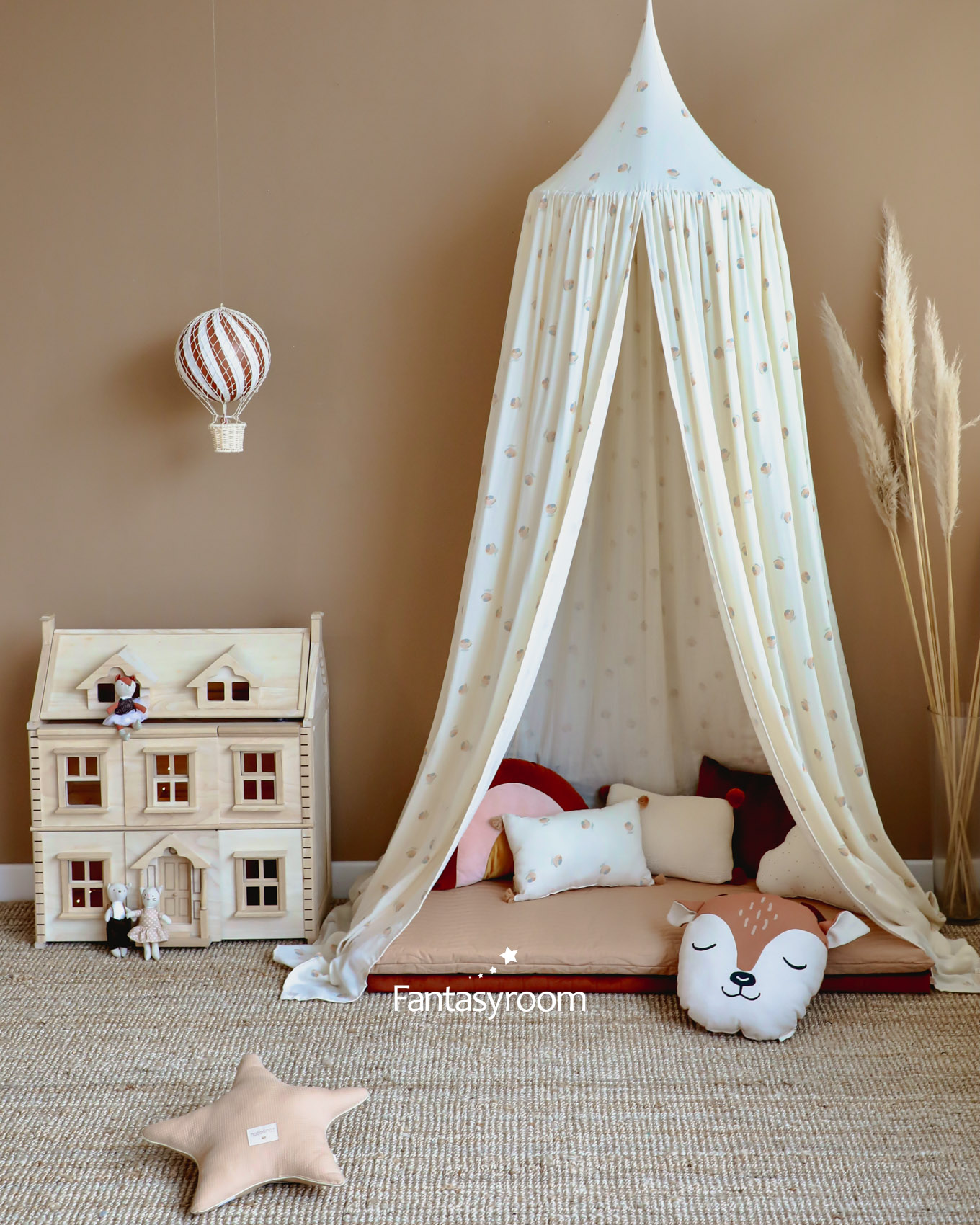 Mit Baldachinen bzw. Betthimmeln kannst du ebenfalls eine gemütliche Kuschelecke einrichten die nicht viel Platz braucht. Dabei wird der Betthimmel einfach an einem Deckenhaken frei im Raum aufgehängt. Meist wird dafür eine Zimmerecke eingeplant, damit der Himmel möglichst wenig Platz einnimmt. Schließlich soll die Kuschelecke keine Spielfläche wegnehmen. Der Stoff sollte schön weit ausgestellt werden, um genug Platz in der Kuschelecke zu bieten. Dafür solltest du den Himmel tiefer hängen als z.B. über einem Bett. Optimal ist es, wenn der Stoff ca. 20-30 cm locker auf dem Boden aufliegt.