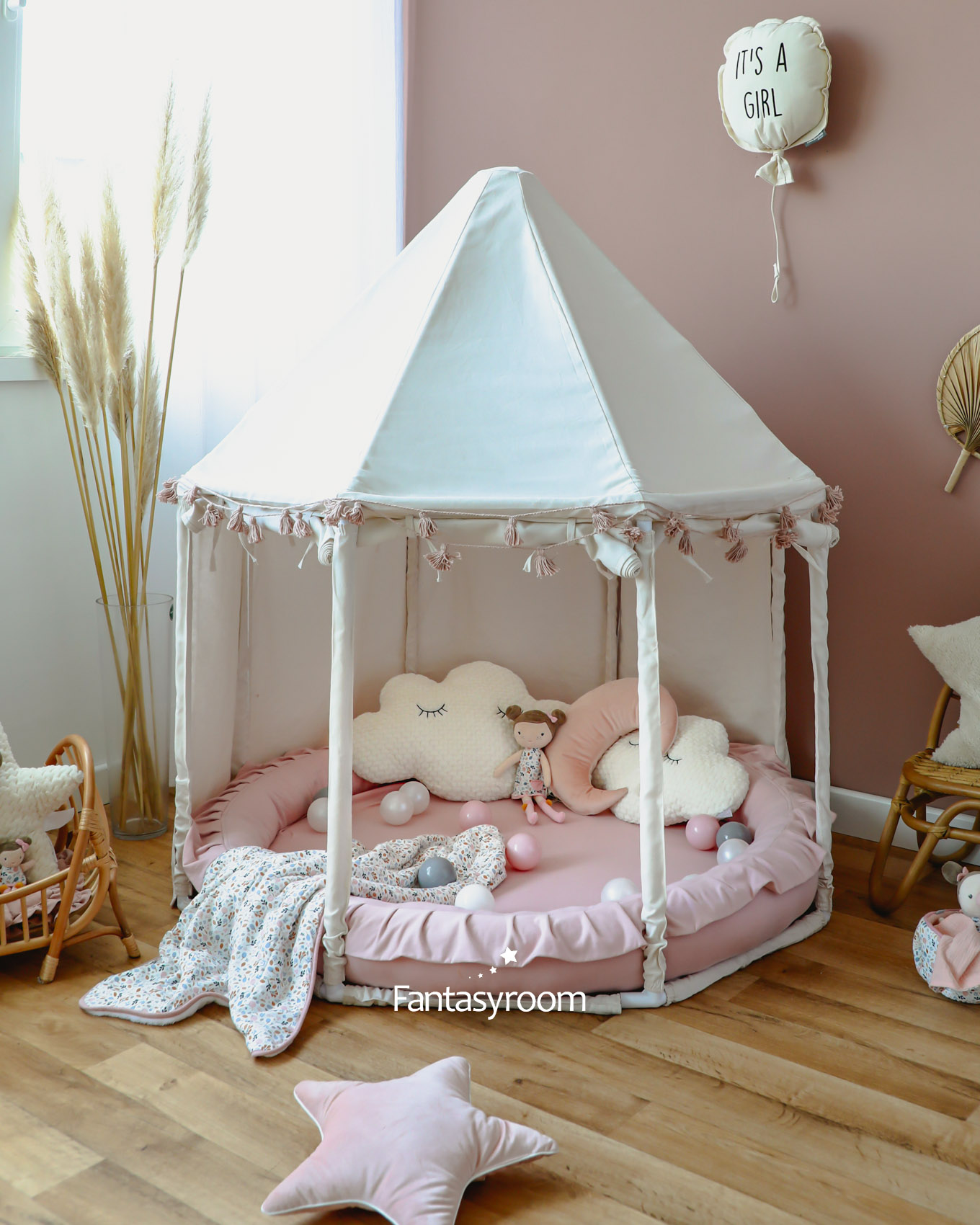 Eine hübsche und sehr gemütliche Kuschelecke entsteht, wenn du deinen Baldachin oder Pavillon mit einer schönen, großen Spielmatte mit erhöhtem Rand ergänzt. Nicht nur, dass diese Matten schön bequem sind und ihr Rand die Kissen an Ort und Stelle hält, sie sind auch schon für Babys eine sinnvolle Anschaffung und ersetzen oft die Krabbeldecke.